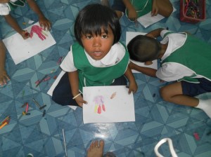 The first week: we worked with Alphabet flashcards and pictures so they could start identifying objects with letters. They learned colors and got an understanding of the rainbow through clay and drawing. I had them trace their hands, we discussed the names of each finger, wrote “Rainbow” and then colored each finger. They had a ball learning “Head, Shoulders, Knees, and Toes” and it was a great way to teach them parts of the body. It was fun to see their concentration as I had them draw their own face and identify the parts.